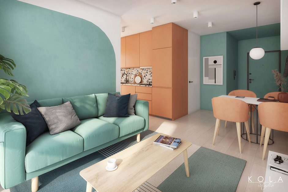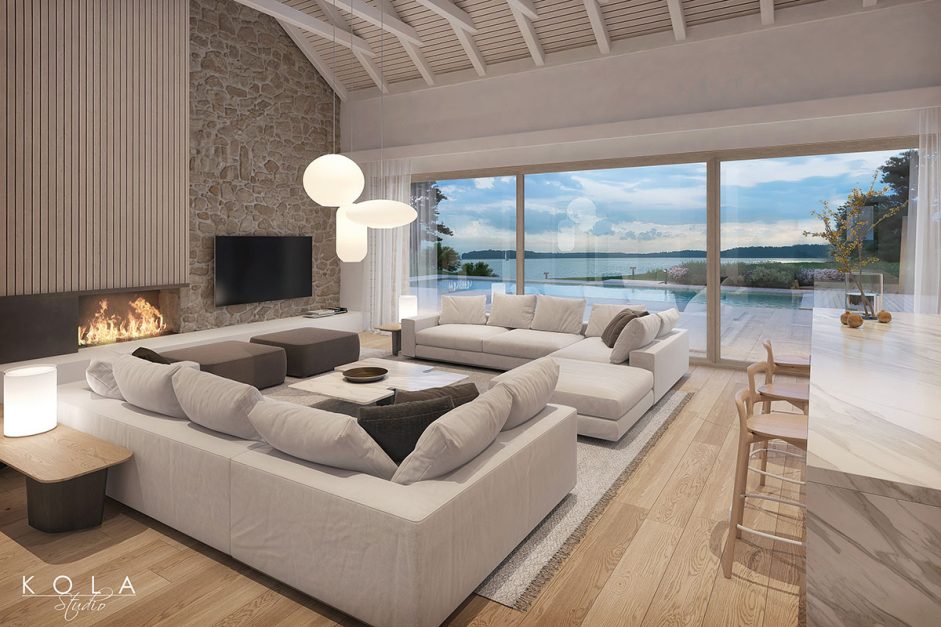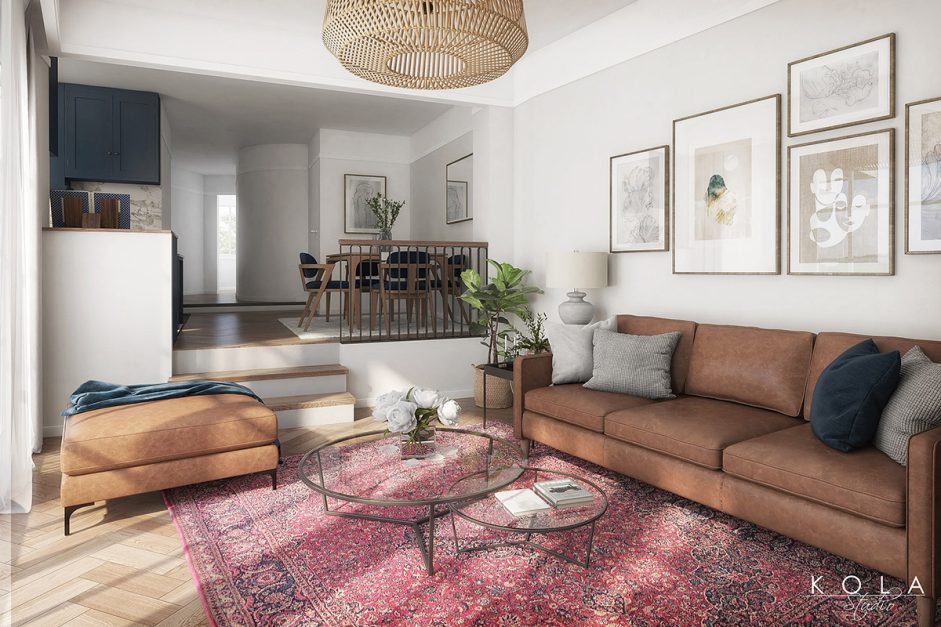 Interior design and visualizations of an elegant and glamour style living room, showcasing dimentions and arrangement possibilities of an apartment for sale. Images perpared for real-estate marketing purposes.